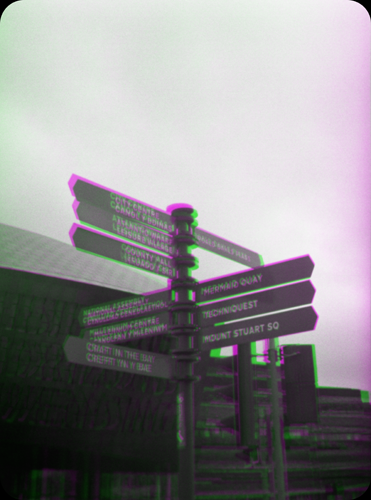 Taken by the traffic light in front of the Wales Millennium Centre WMC for short or more un-affectionately known as the slug. I enjoy taking pictures of fingerposts they work extremely well in 3d. They also provide a whole host of possibilities depending which direction you venture towards. For example if you were to go in the direction of the lone fingerboard you would end up in the Roald Dahl plaza, Where many great events take place including the Cardiff food festival, Maritime festival and there has even been a circus held in this amazing space.